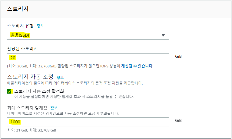 스토리지 유형=프로비저닝된 IOPS(SSD)으로 월별 추정 요금 사항에 변화가 없지만 사용 시 요금이 발생된다.