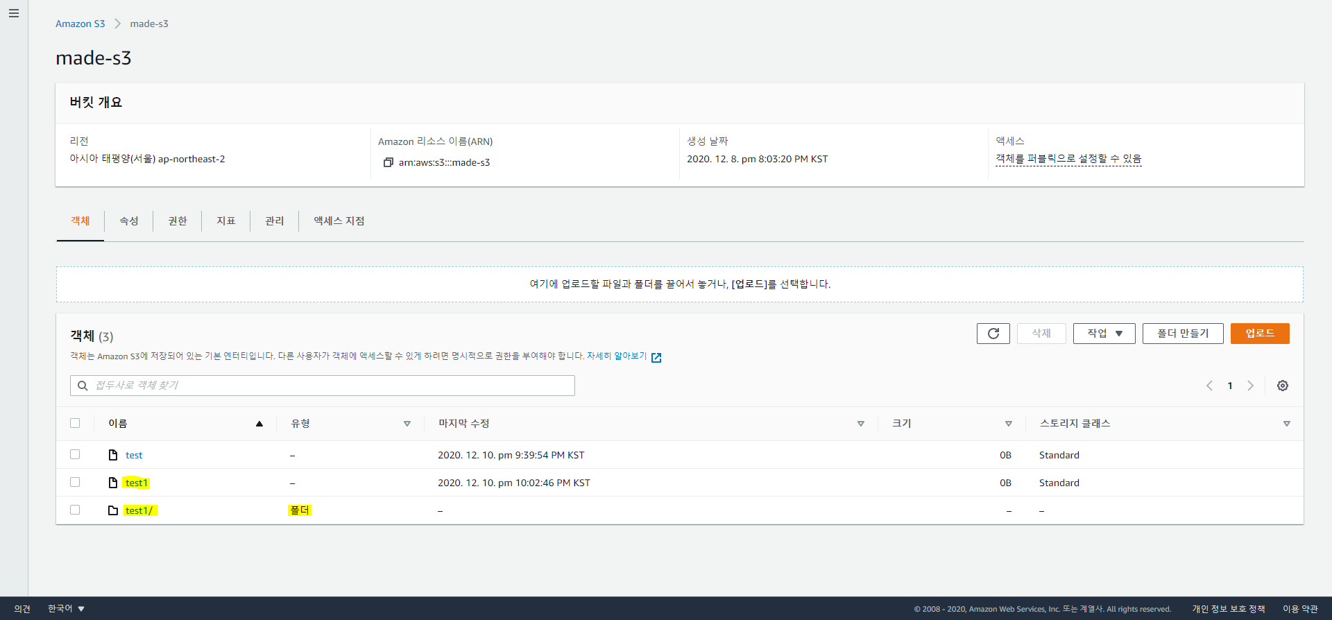 폴더의 모든 파일 퍼블릭 적용 : 생성한 버킷 클릭 > 폴더 체크 > 작업 > 퍼블릭으로 설정 클릭 > 퍼블릭으로 설정 클릭 > 종료 클릭 > 퍼블릭으로 설정한 폴더 클릭 > 파일 클릭 > 객체 URL 클릭.