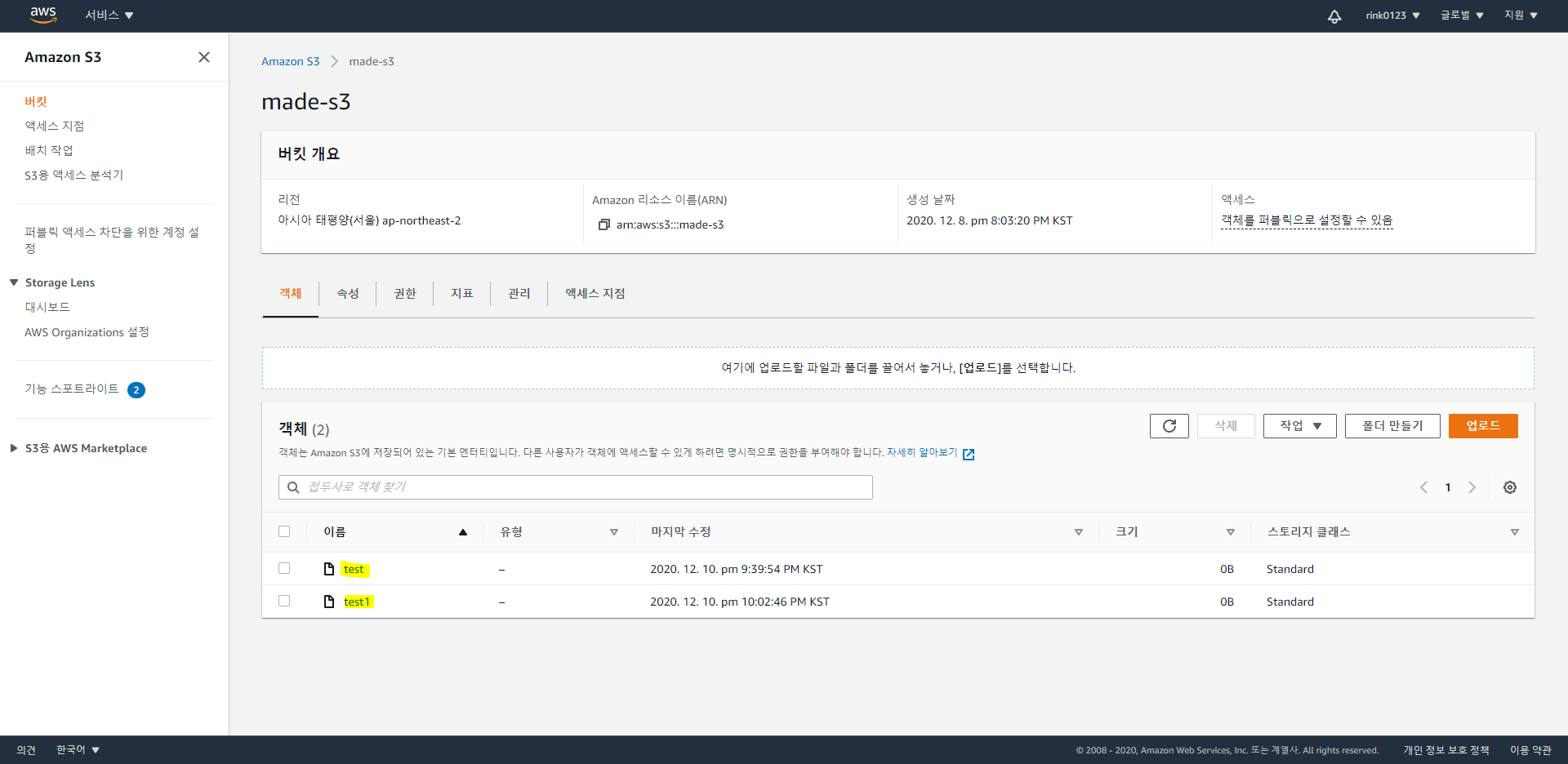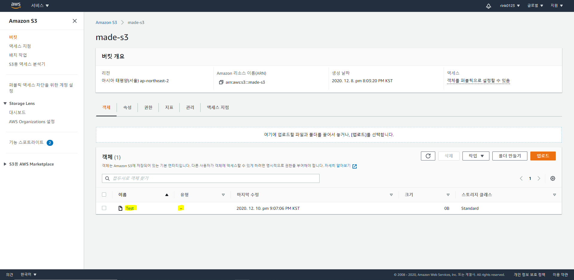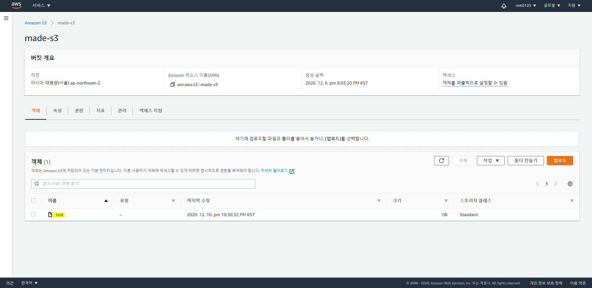 Bucket에서 직접 앨범 생성 후 파일 추가 시 앨범 삭제 방지 객체 파일이 추가되어 있다. Bucket에서 확인할 수 없으며 JavaScript용 S3를 통해 확인이 가능하다. JavaScript용 S3에서 앨범 삭제 방지 객체 파일까지 삭제하면 앨범도 삭제된다.