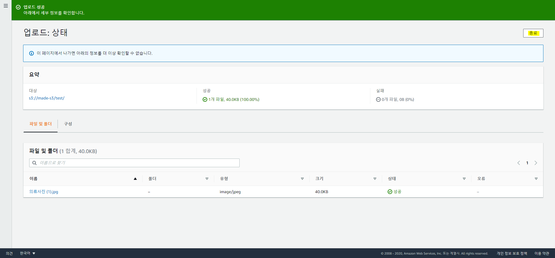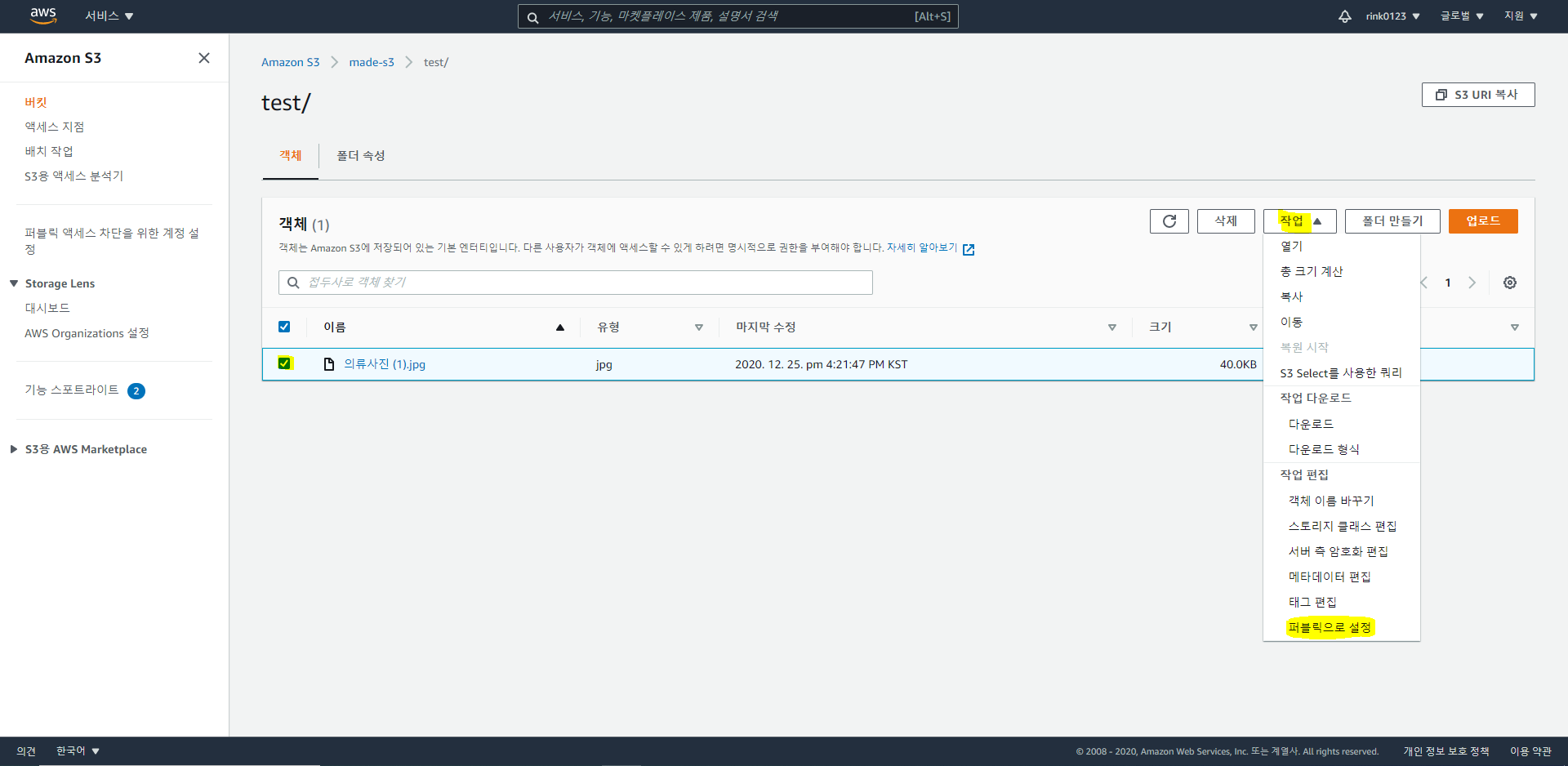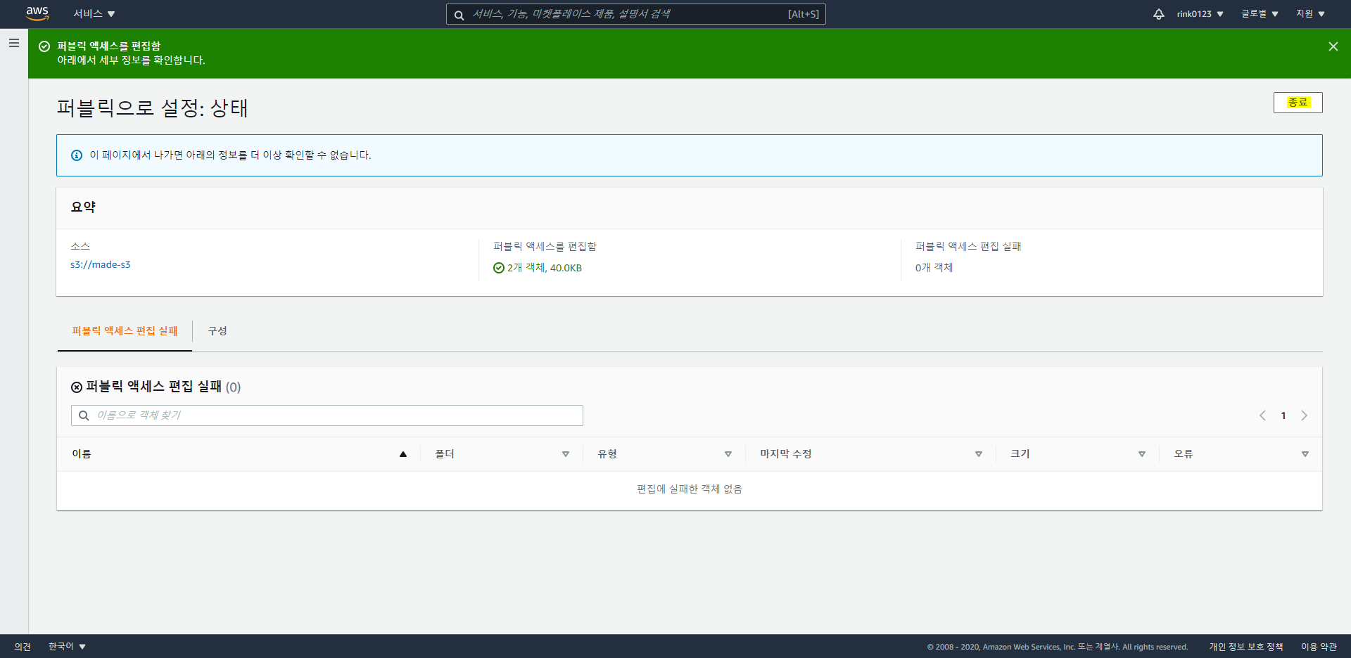 파일 단위 퍼블릭 적용 : 생성한 버킷 클릭 > 폴더 클릭 > 원하는 파일 체크 > 작업 > 퍼블릭으로 설정 클릭 > 퍼블릭으로 설정 클릭 > 종료 클릭 > 퍼블릭으로 설정한 파일 클릭 > 객체 URL 클릭.