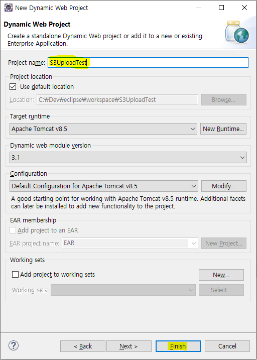 Ecliipce IDE 실행 > Ctrl+N > Dynamic Web project 검색 또는 선택 > Project name 입력 > Finish 클릭.