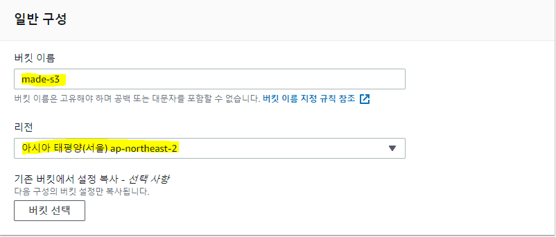 3.1) 버킷 이름=한글 안됨 , 리전=현재 위치.