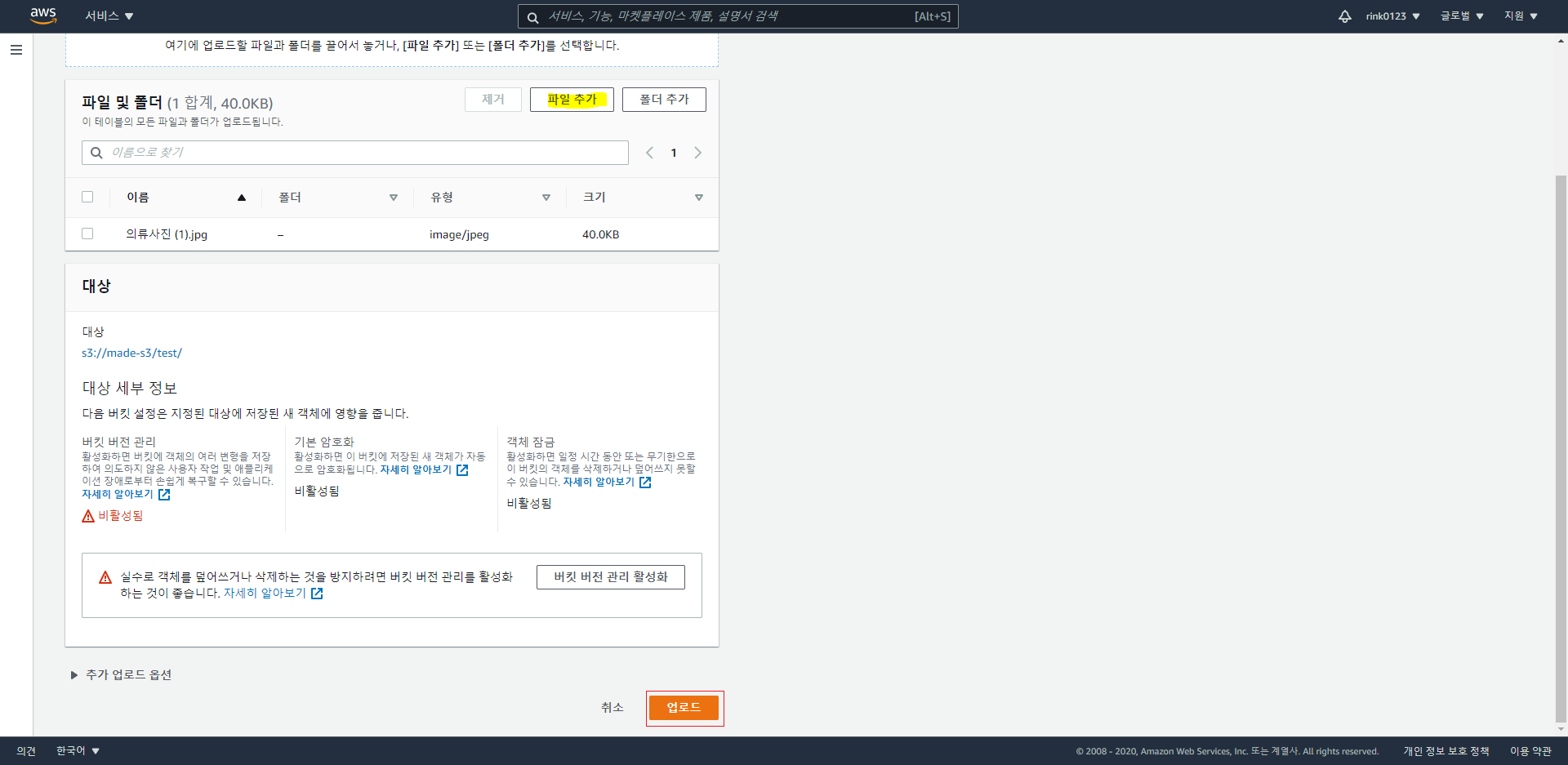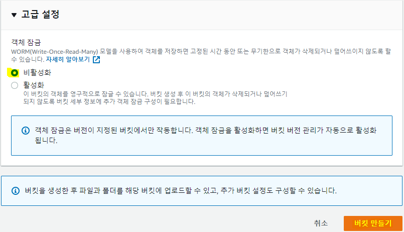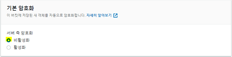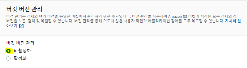 동일한 파일명이 버킷에 업로드되면 버전별(ID로 구분)로 관리할 수 있지만 용량을 차지하기에 비활성화로 체크한다.