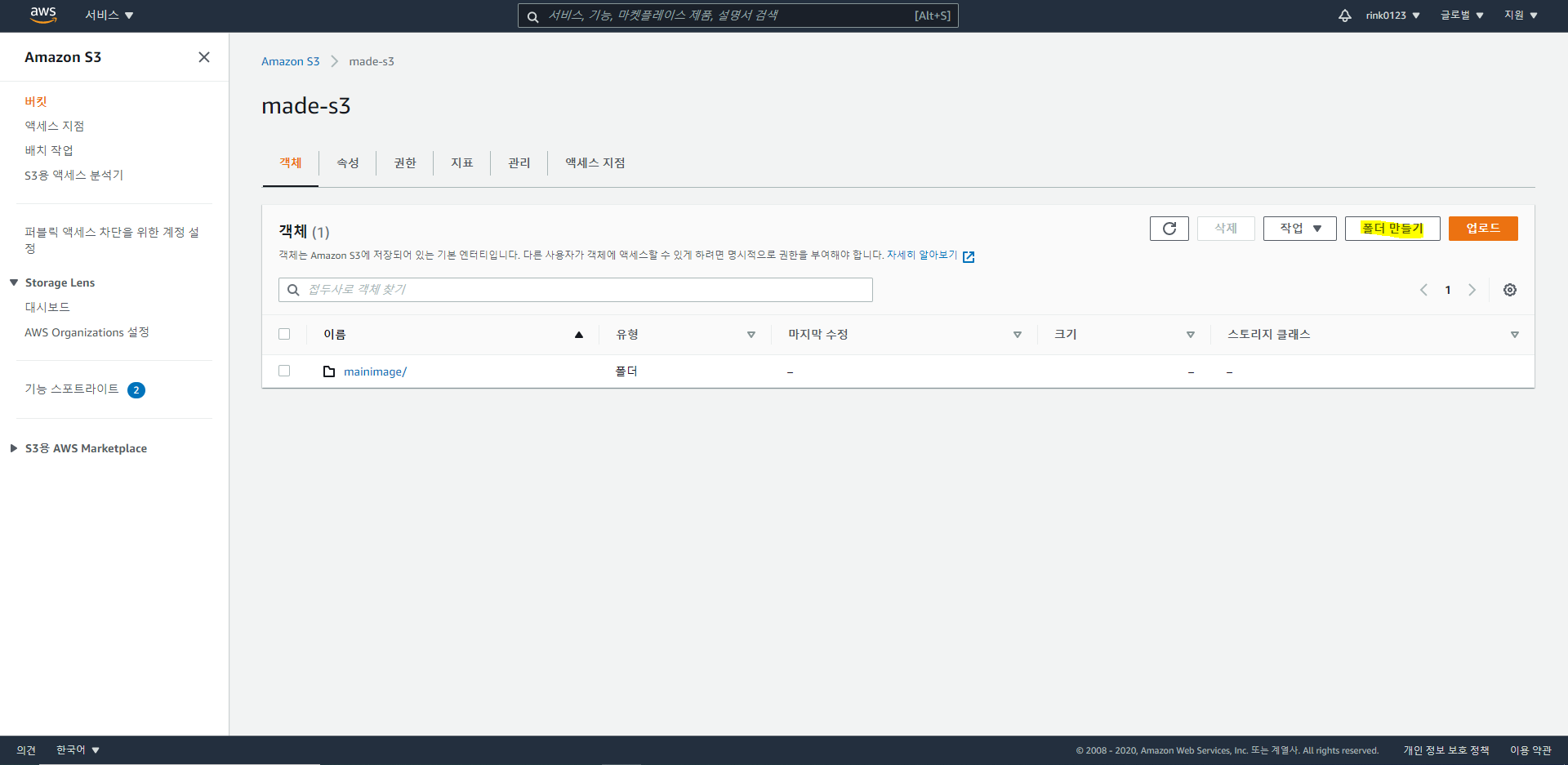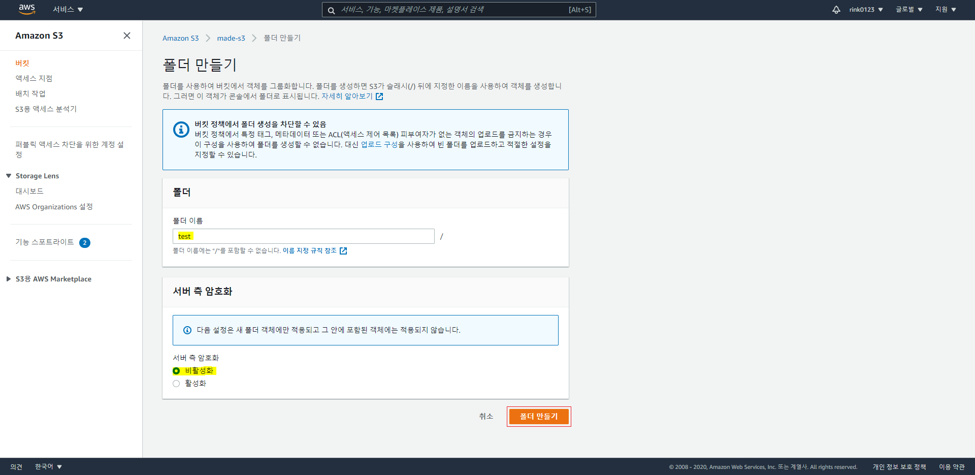 13) S3 Console > 버킷 > 생성한 버킷 클릭 > 폴더 만들기 클릭 > 폴더 이름="/" 빼고 아무렇게 , 서버 측 암호화=비활성화 > 폴더 만들기 클릭.