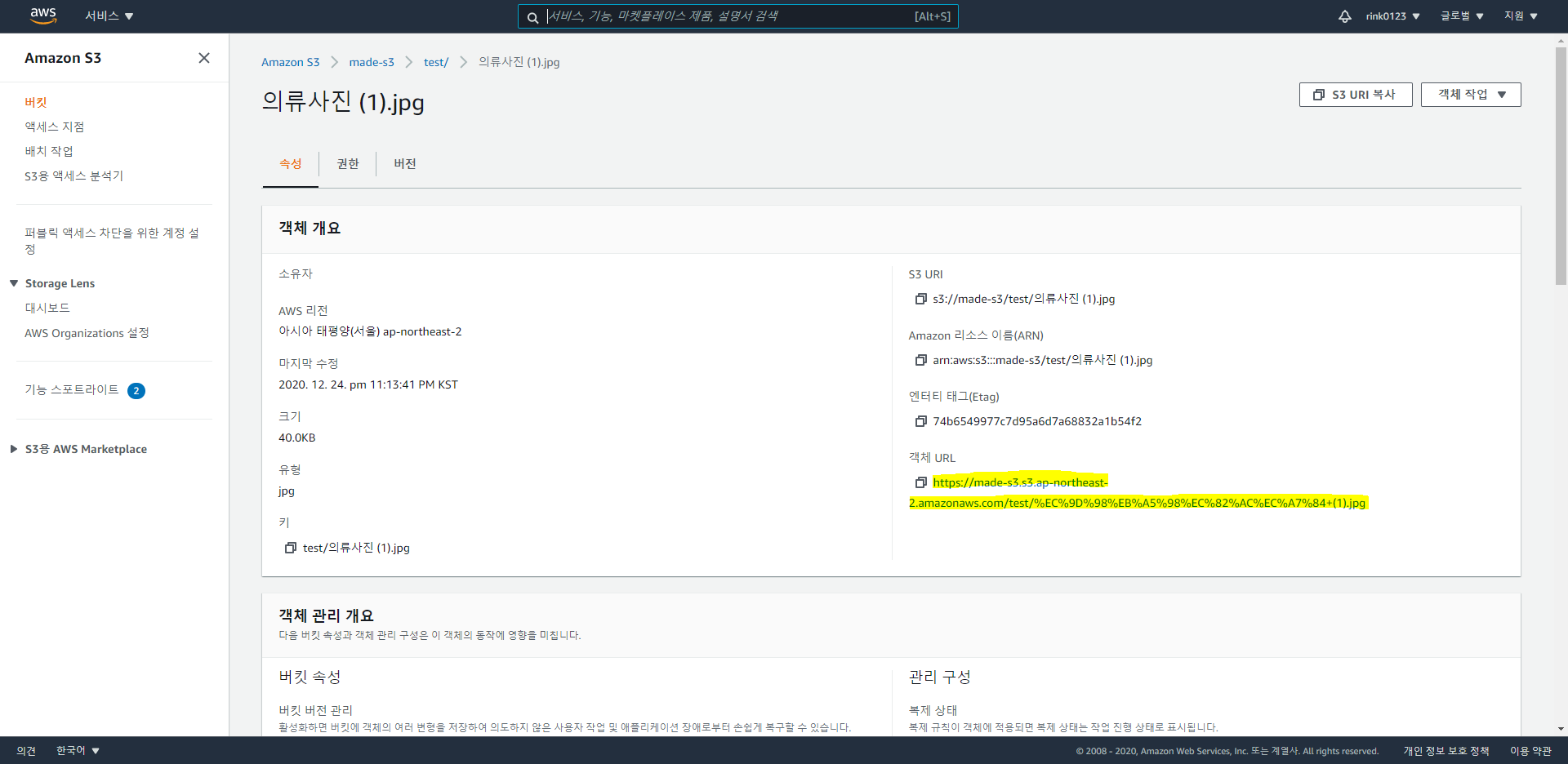 객체 URL : Bucket명.s3.리전.amazonaws.com/폴더명/encodeURIComponent(파일명).파일확장자