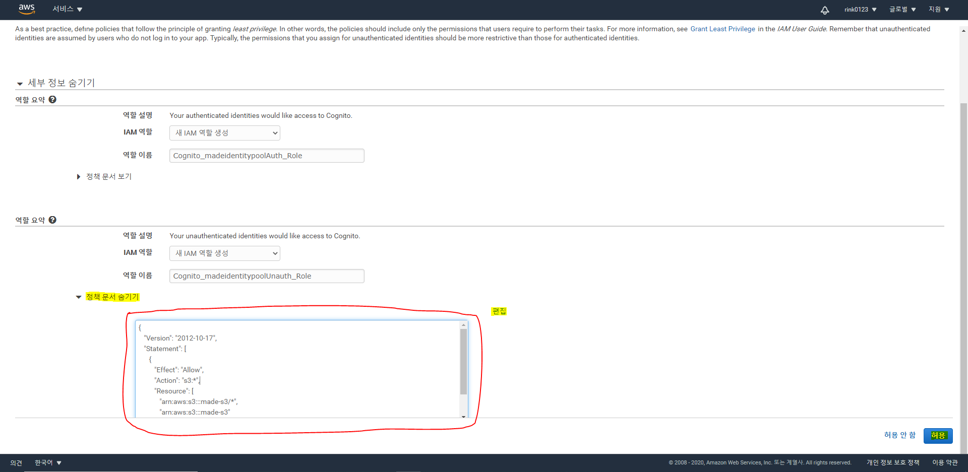 9.2) unauthenticated identities_정책 문서 보기 클릭 > 편집 클릭 > 알림창 확인 클릭 > 아래 JSON 복사 후 편집창에 붙여 넣기 > BUCKET_NAME을 생성한 S3 Buckey 이름으로 수정 > 허용 클릭.