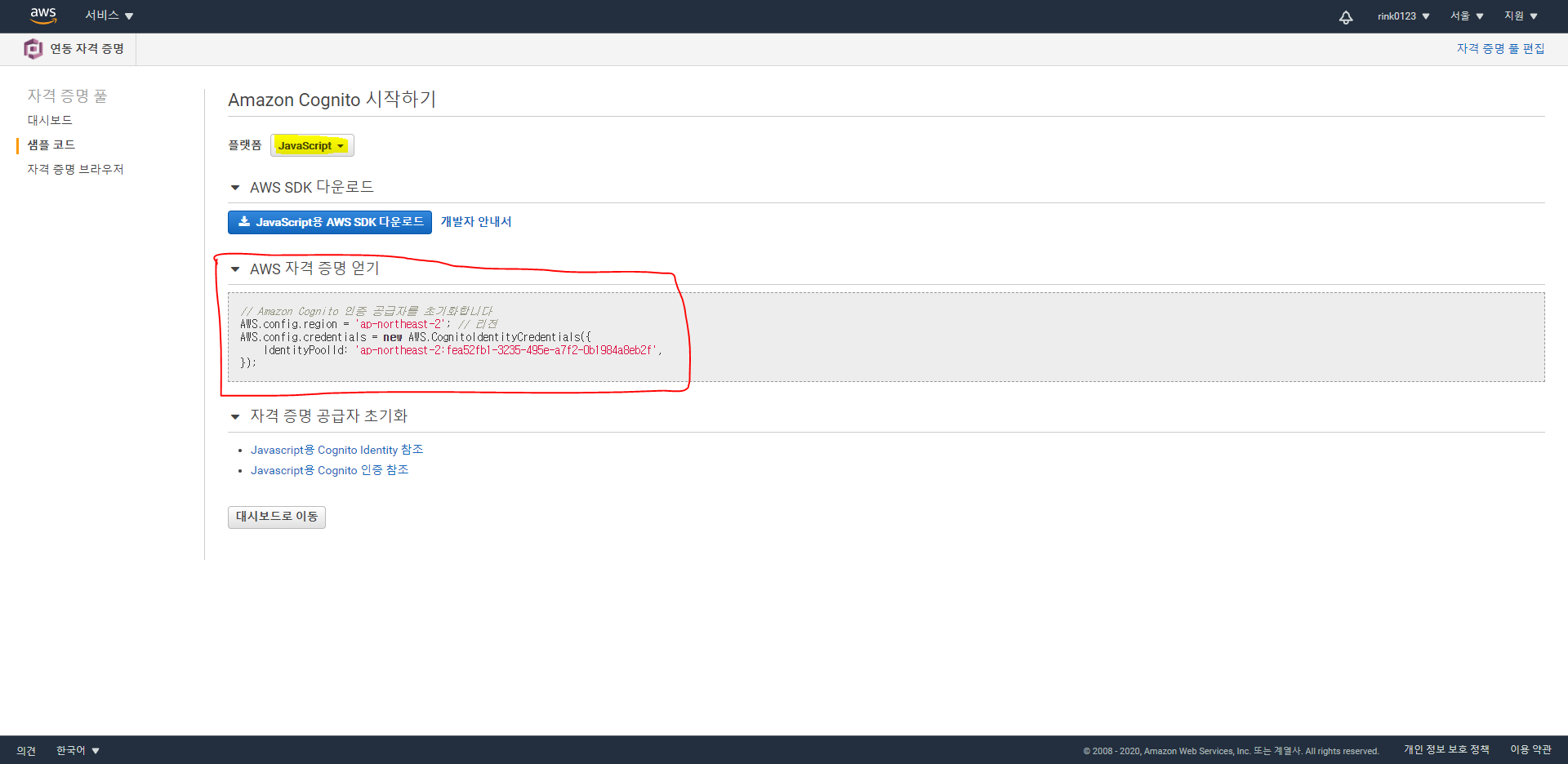 10) 자격 증명 풀 생성 확인 > 플랫폼=JavaScript > AWS 자격 증명 얻기 내용 복사 후 보관.