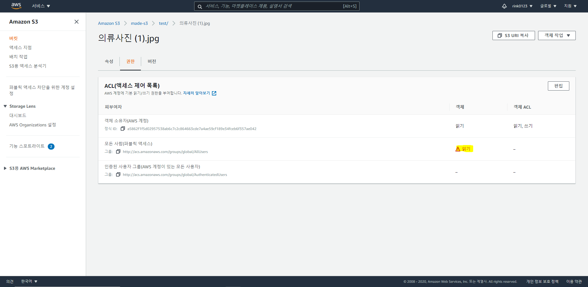 폴더를 퍼블릭으로 설정 적용하면 해당 하위 파일들을 읽을 수 있다. 파일_권한 탭을 보면 모든 사람(퍼블릭 액세스)_객체=읽기 권한으로 수정되어 있다.