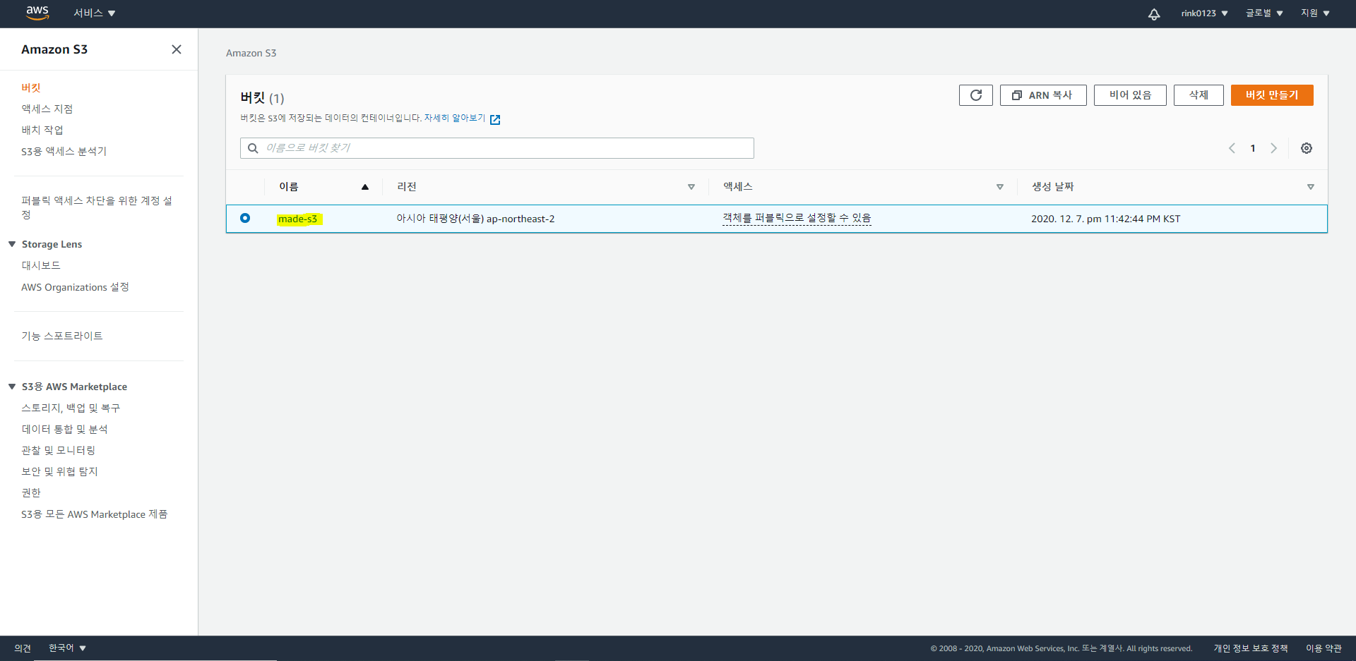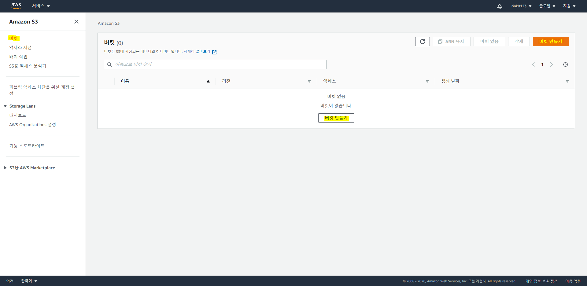 2) S3 Console > 버킷 > 버킷 만들기 클릭.