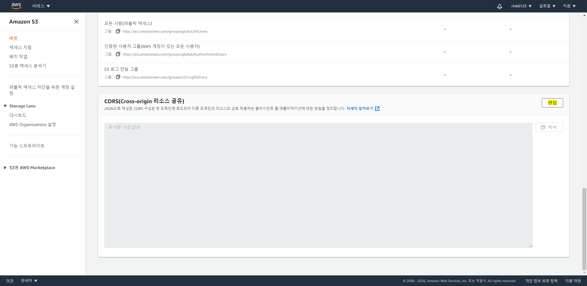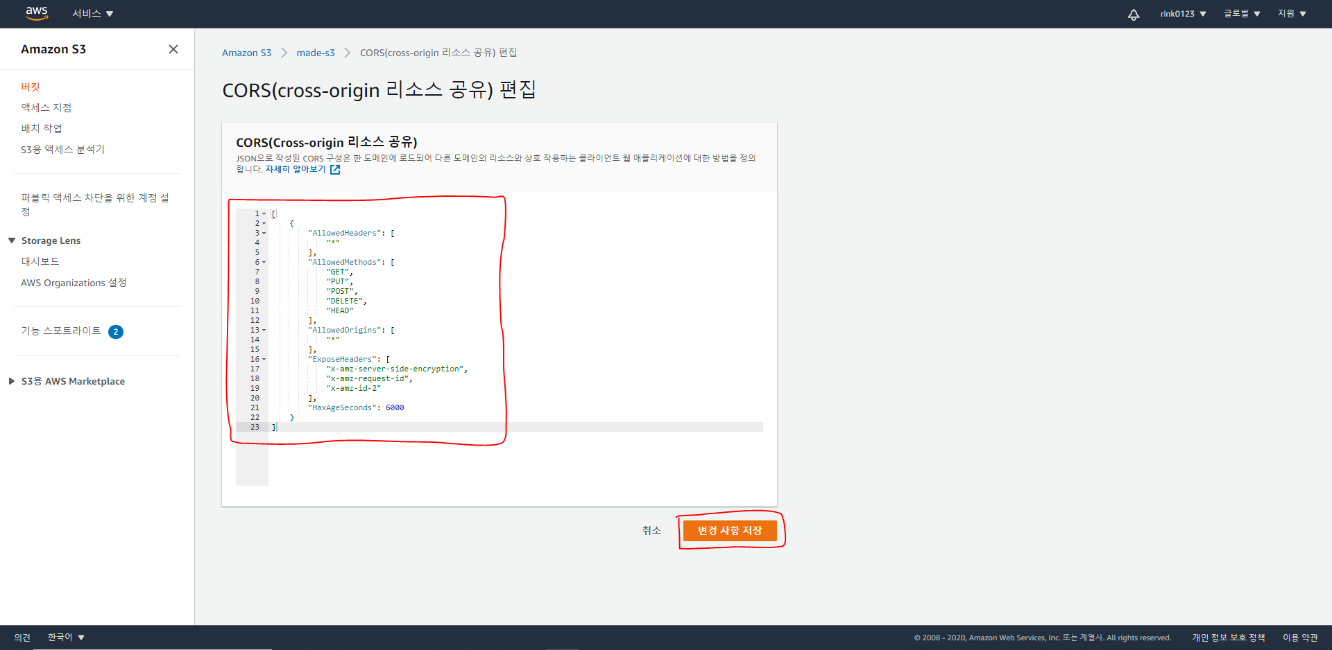 5) S3 Console > 버킷 > 생성한 버킷 클릭 > 권한 탭 클릭 > CORS(Cross-origin 리소스 공유)_편집 클릭 > 아래 JSON 복사 후 편집창에 붙여 넣기 > 변경 사항 저장 클릭.