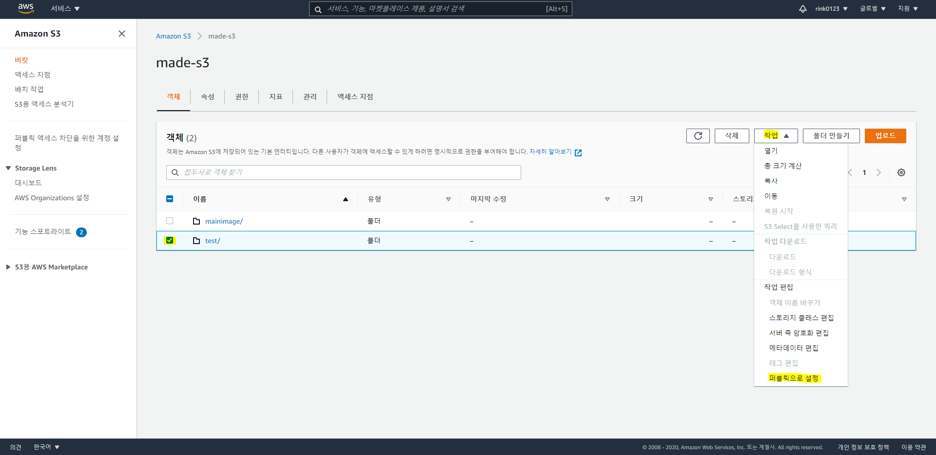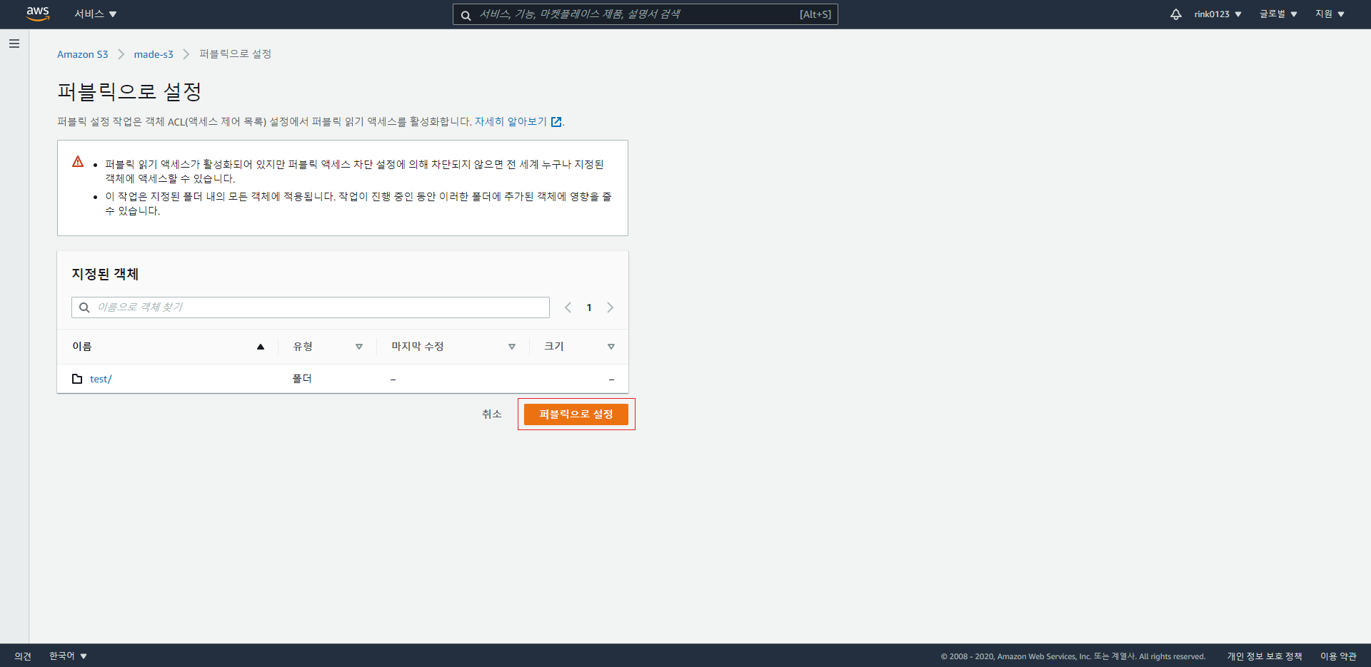 개발한 홈페이지에 미리 버킷으로 직접 넣어둔 이미지 파일을 정상적으로 불러오기 위해선 해당 파일이 있는 폴더를 퍼블릭으로 설정해야 한다.