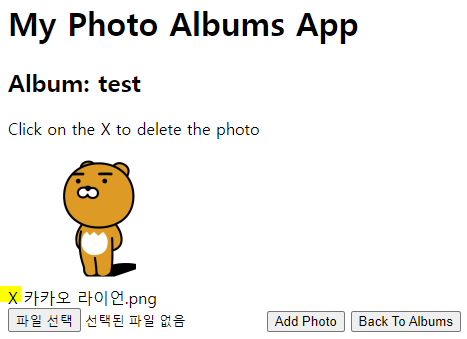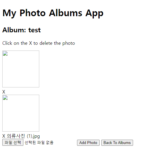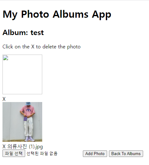 앨범 생성 및 파일 추가 > 삭제할 파일 'X' 클릭 > 알림창 "Successfully deleted photo" 확인 클릭 > 파일 삭제 확인.