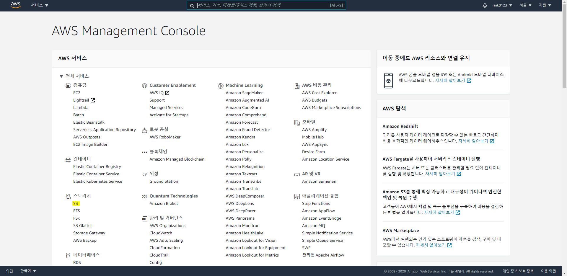 리전은 현재 위치로 지정. 다른 나라일 시 송수신 속도에 영향이 감.