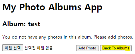 파일 추가 없이 Back To Albums 버튼 클릭 시 객체 유형으로 생성, listAlbums 창에 방금 전 생성한 앨범이 나오지 않는다.