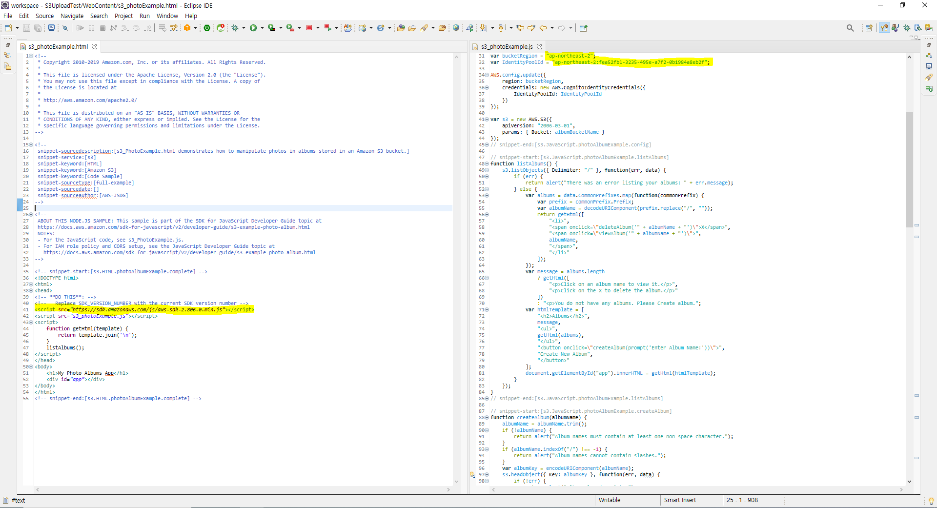 생성한 JavaScript File에 12번 항에서 복사해둔 JavaScript Source 붙여 넣기 > 11번 항에서 복사해둔 AWS 자격 증명 얻기 내용 var bucketRegion=AWS.config.region의 값, var IdentityPoolId=IdentityPoolId의 값 붙여 넣기.