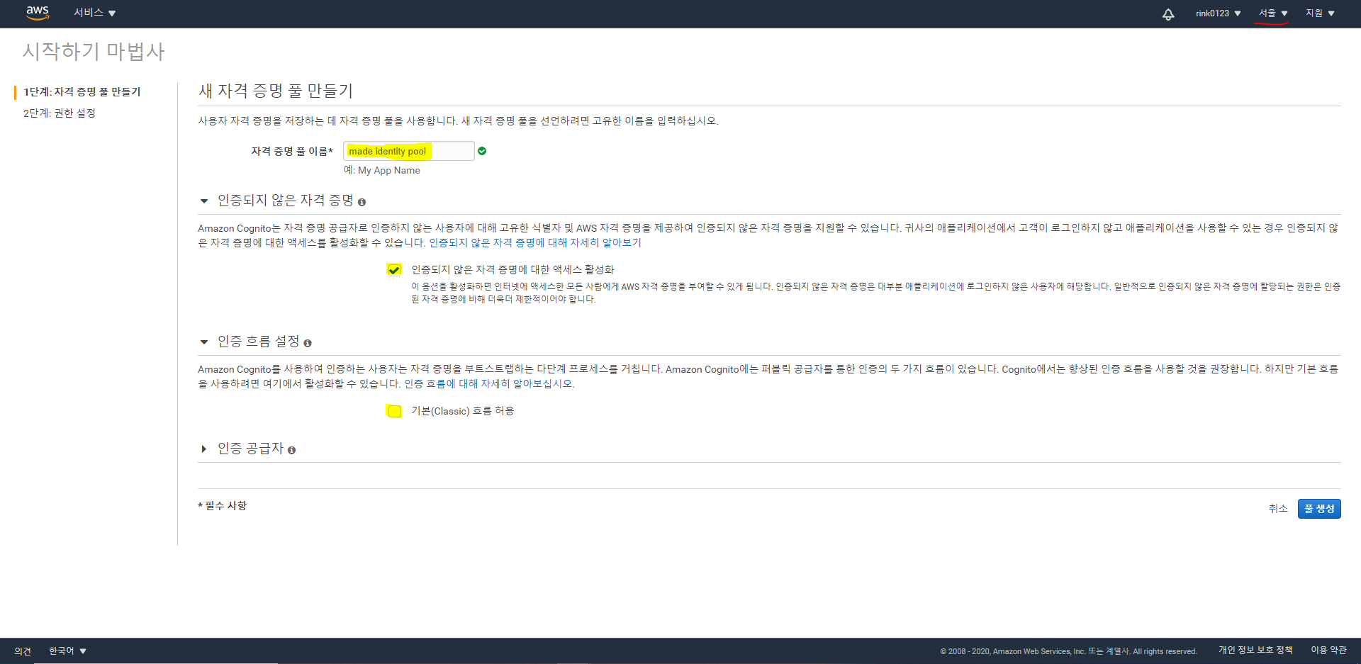 9.1) 리전=S3 Buckey과 같은 리전 > 자격 증명 풀 이름=한글 안됨 , 인증되지 않은 자격 증명에 대한 액세스 활성화=체크 , 기본(Classic) 흐름 허용=체크 해제 > 풀 생성 클릭.