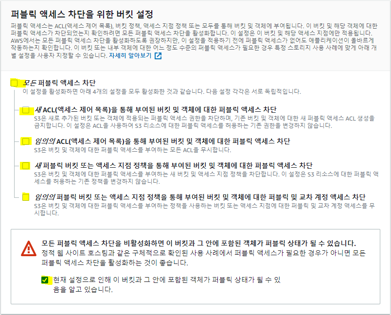 3.2) 모든 퍼블릭 액세스 차단=체크 해제.