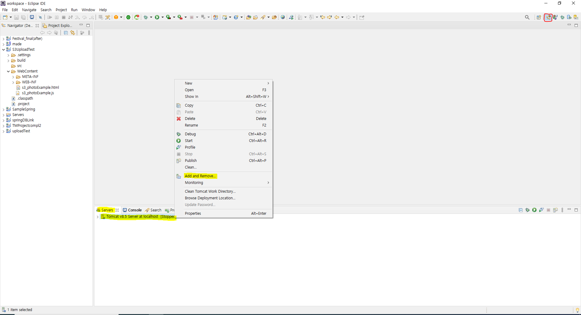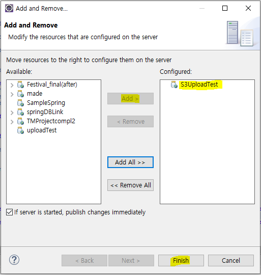 12.2) 우측 상단에 Java EE 클릭 > 하단 Server탭 클릭 > Tomcat Server 우클릭 > Add and Remove... 클릭 > Available 목록에서 생성한 Dynamic Web project 클릭 > Add 클릭 > Configured에 추가된 것 확인 후 Finish 클릭.