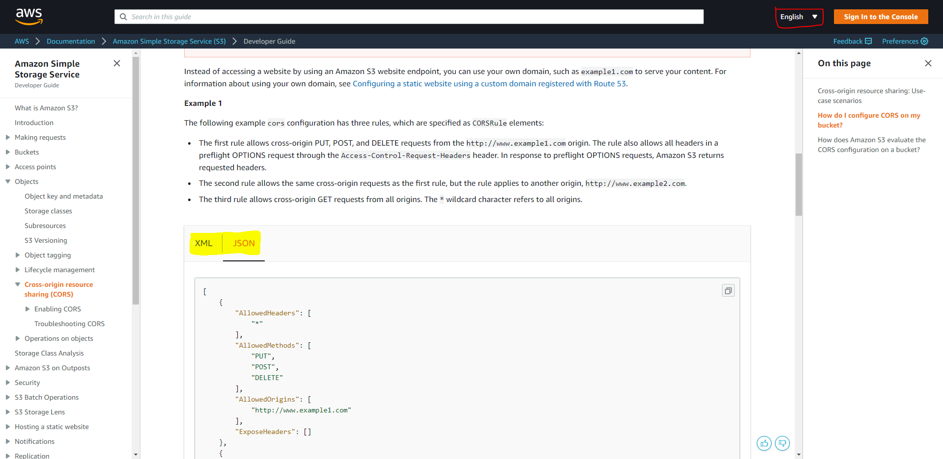 CORS JSON에 대한 내용은 CORS(Cross-origin 리소스 공유)_자세히 알아보기 링크 클릭 > 언어 설정=English. 아래 그림처럼 홈페이지 언어 설정=English로 해야 JSON 내용을 확인할 수 있다. 한국어로 할 경우 XML 내용만 나온다.