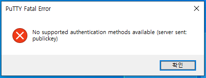 알림창 "PuTTY Fatal Error" 내용 : 지원되는 인증 방법이 없음(서버 전송: 공용 키).