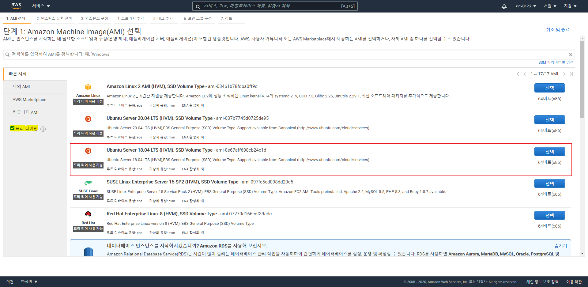 3.1) 좌측_프리 티어만=체크 > 원하는 AMI 선택.