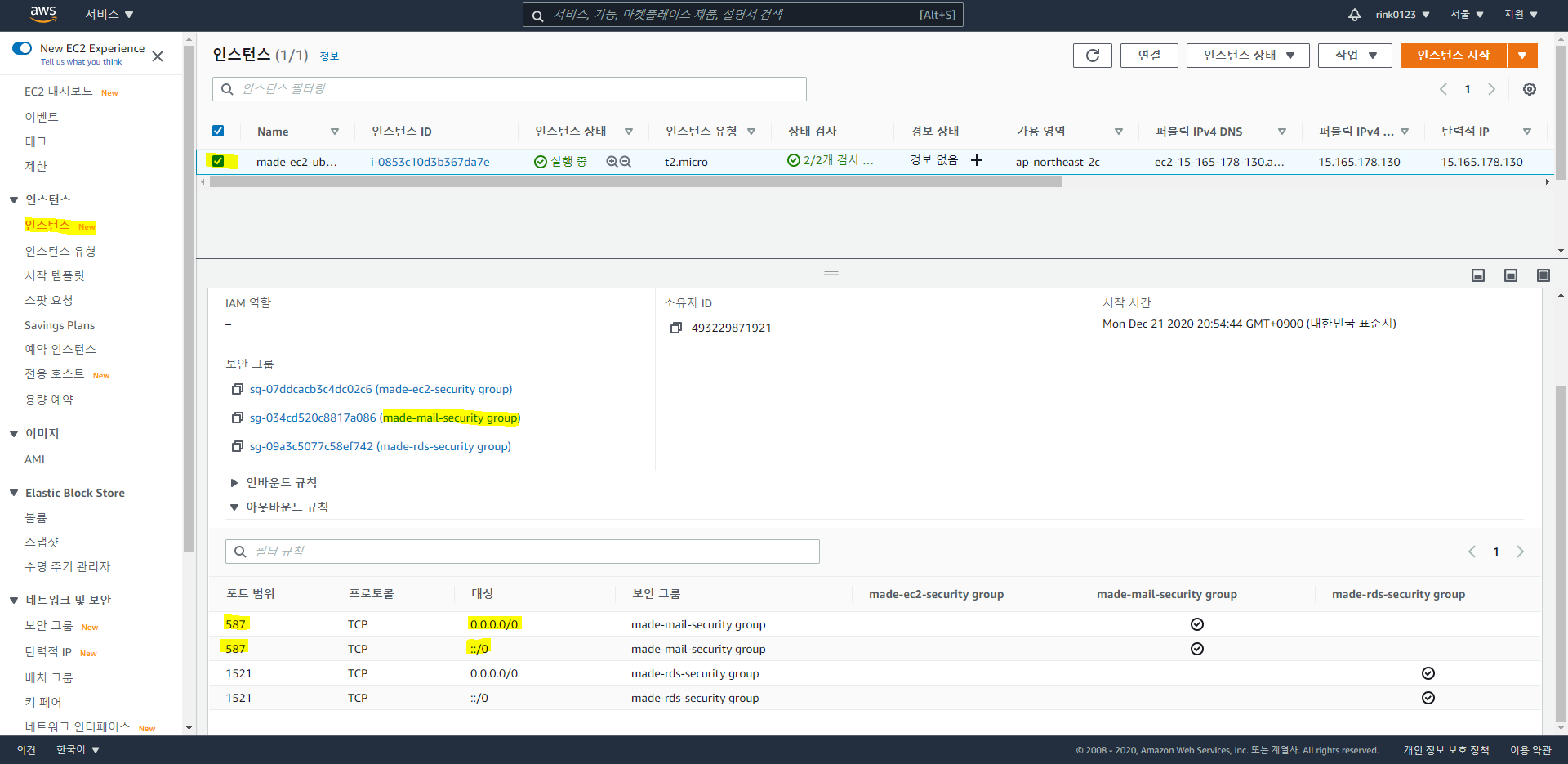 [참고] JavaMail [참고] A List of SMTP and IMAP Server - Arclab Software [참고] EC2에 배포한 Django 어플리케이션에서 Gmail SMTP로 발신 운영체제(OS) : Windows 10 64bit, Linux Ubuntu 18.04 개발환경 : JDK8, Tomcat8 개발도구 : PuTTY(푸티) Java에서 Gmail 사용에 관한 것이므로 참고. 개인 정보 보안을 위해 개발용으로 Google 부계정으로 진행. AWS - 보안 그룹, EC2 인스턴스 확인 1) 해당 인스턴스에 Mail 관련 보안 그룹이 연결되어 있는지, 값이 맞는지 확인. 인바운드 규칙=수신 측 / 아웃바운드 규칙=발신 측. 인스턴스에 연결된 Mail 보안 그룹-포트 범위, 프로토..